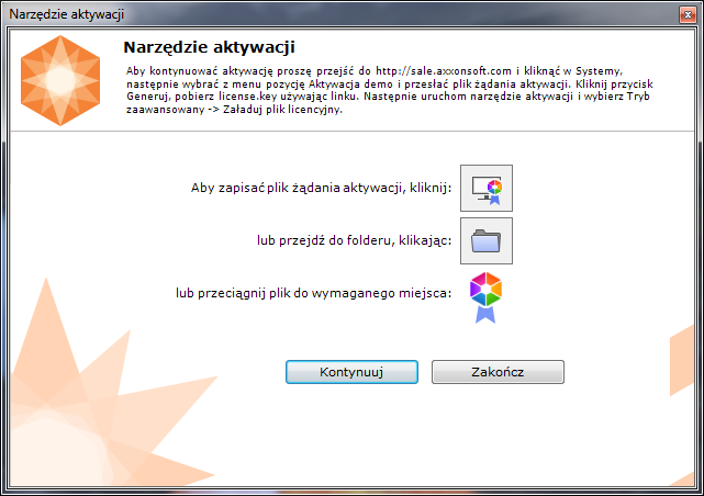 Kliknij przycisk Kontynuuj, aby powrócić do strony głównej narzędzia aktywacyjnego. Aby zakończyć, kliknij przycisk Zakończ. Aby zamknąć narzędzie i uruchomić klienta Axxon Next, kliknij Uruchom Axxon Next.