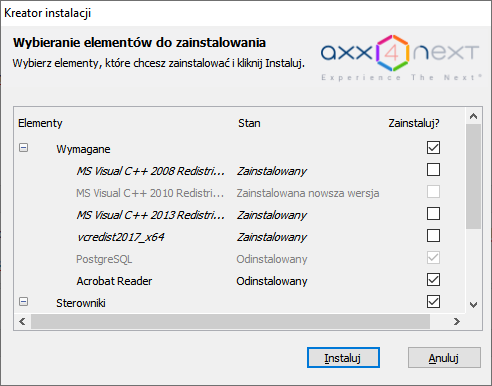 Następujące oprogramowanie będzie zainstalowane, jeśli będzie to konieczne: