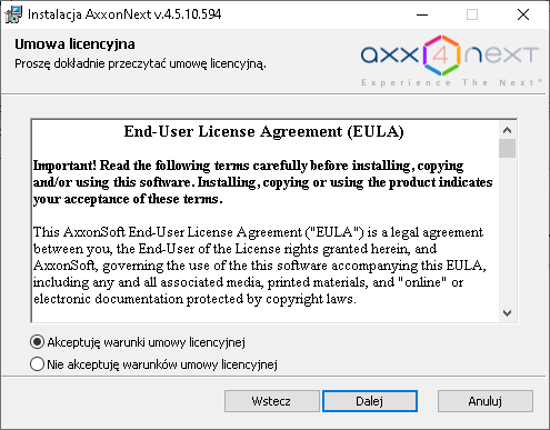 9. Po zakończeniu instalacji niezbędnego oprogramowania oraz sterowników, rozpoczyna się instalacja Axxon Next. Naciśnij przycisk Dalej.