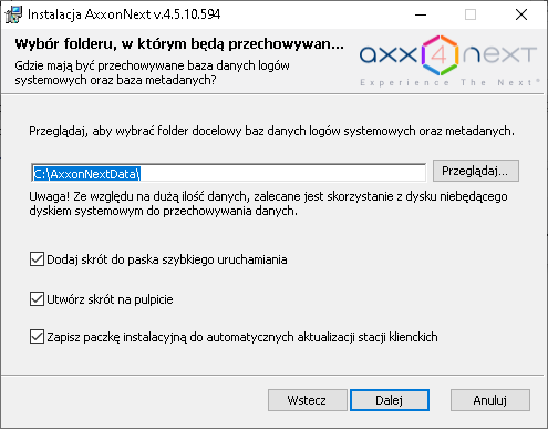 11. Wybierz katalog do przechowywania bazy danych logów oraz bazy danych metadanych dla Axxon Next i naciśnij przycisk Dalej