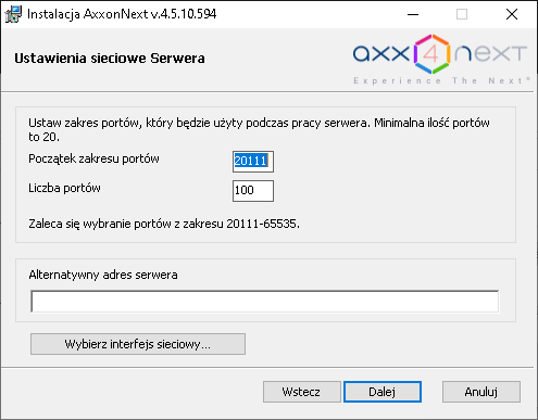 Pełna lista portów jest dostępna na stronie Porty używane przez Pakiet Oprogramowania Axxon Next. Jeśli na serwerze była zainstalowana wersja Axxon Next starsza niż 4.5.0, baza danych PostgreSQL nadal będzie korzystać z portu 49998. Po zakończeniu instalacji można go manualnie zmienić (zobacz: Konfigurowanie portów Serwera).
