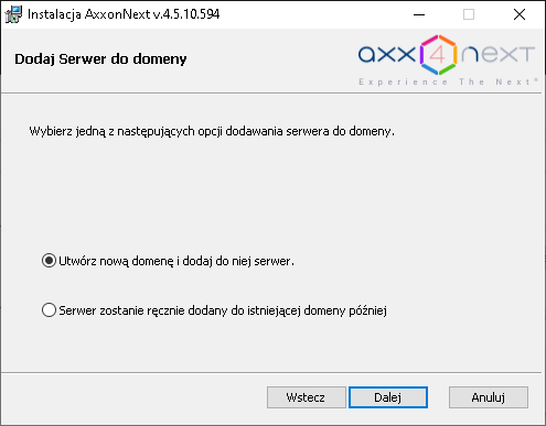 25. Stwórz nową Domenę Axxon o nazwie Default (jeśli chcesz zapoznać się z definicją Domeny Axxon, przejdź do Załącznik 1. Glosariusz). Jeśli chcesz dodać komputer do Domeny Axxon później, zaznacz Serwer zostanie później dodany ręcznie do istniejącej domeny. Naciśnij przycisk Dalej.