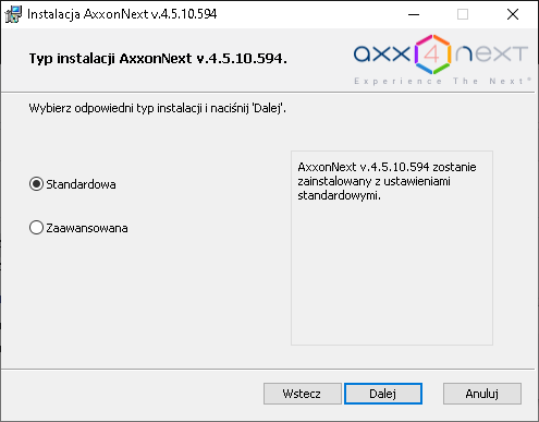 4. Wybierz typ instalacji Axxon Next w oknie dialogowym poprzez naciśnięcie odpowiedniego przycisku: