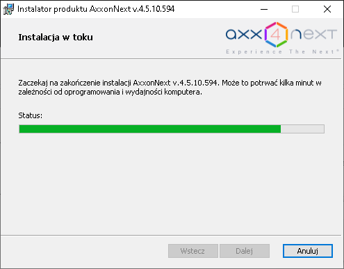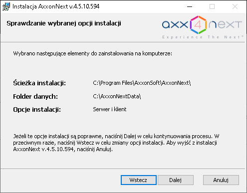 26. Sprawdź poprawność ustawień instalacji, i naciśnij przycisk Dalej, by rozpocząć instalację. Rozpocznie się instalacja Axxon Next.