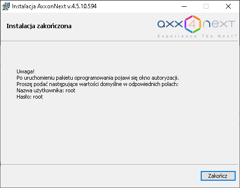 Po pewnym czasie, wyświetli się okno, które określi, czy instalacja Axxon Next zakończyła się powodzeniem.