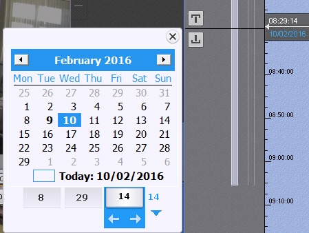 Naciśnij na wskaźnik; otwarty zostanie kalendarz. Wybierz datę, do której chcesz przejść w archiwum, a następnie wyznacz czas w formacie HH:MM:SS korzystając ze strzałek bądź klawiszy numerycznych na klawiaturze.