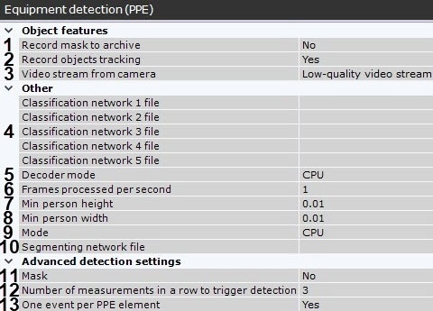 By default, each equipment element triggering occurs once during a continuous tracking of a person. You can set triggering to multiple by setting the One event per PPE element parameter to No (13).