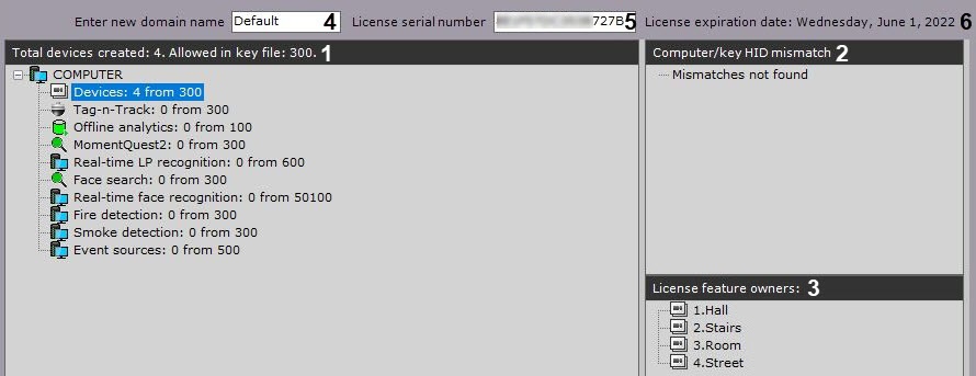 When you select the Axxon domain object in the Total devices created group (1), the software displays information about the Axxon domain and the current license: Servers and their number, IP devices and various used functions.