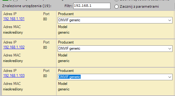 Jeśli wszystkie urządzenia IP zostaną dodane jednocześnie, ten sam tryb (a przez to te same ustawienia) zostanie nałożony dla wszystkich urządzeń.