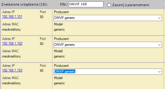 2. Ze względu na producenta, model, bądź adres IP. Aby to uczynić, wpisz frazę w pole Filtr.  Poniższy przykład filtruje wyniki tak, by były wyświetlane tylko urządzenia wykorzystujące ONVIF, których adresy IP zawierają liczbę 168.