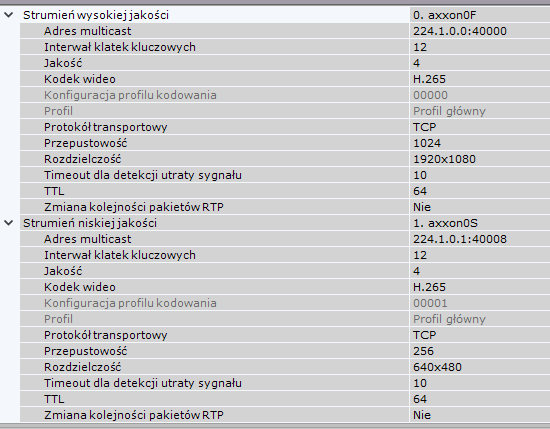 Jeśli kamera nie wspiera multistreamingu, parametry strumieni wideo będą identyczne; tylko parametry dla strumienia wideo wyższej jakości będą mogły być edytowane (parametry strumienia o niskiej jakości będą dopasowywane automatycznie).
