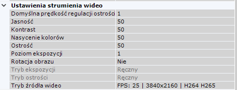 W grupie Ustawienia strumienia wideo istnieje możliwość edycji parametrów obrazu (kontrast, jasność, saturacja etc.). Przy edycji tych parametrów, możesz posłużyć się opisami parametrów w GUI Axxon One. Więcej informacji na temat edycji tych parametrów można znaleźć w dokumentacji technicznej kamery.