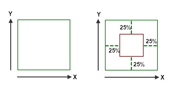 Przykład: zielony kwadrat jest ścieżką obiektu. Jeśli wyznaczysz X oraz Y jako 25%, narzędzie zostanie wyzwolone dopiero wtedy, gdy cały obiekt znajdzie się poza wirtualną linią.