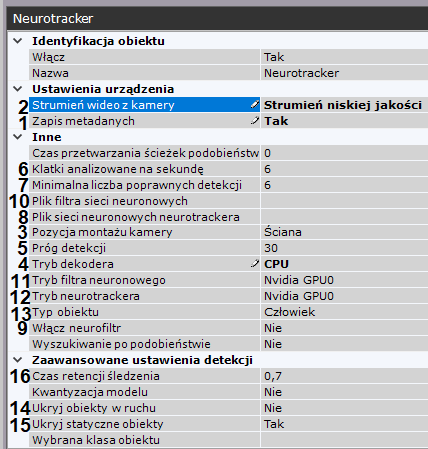 W polu Tryb neurotrackera określ procesor, z którego ma korzystać neurotracker: CPU, NVIDIA GPU lub jeden z procesorów Intel (12, zobacz: Wymagania sprzętowe dla analizy neuronowej, Ogólne informacje o konfigurowaniu detekcji).