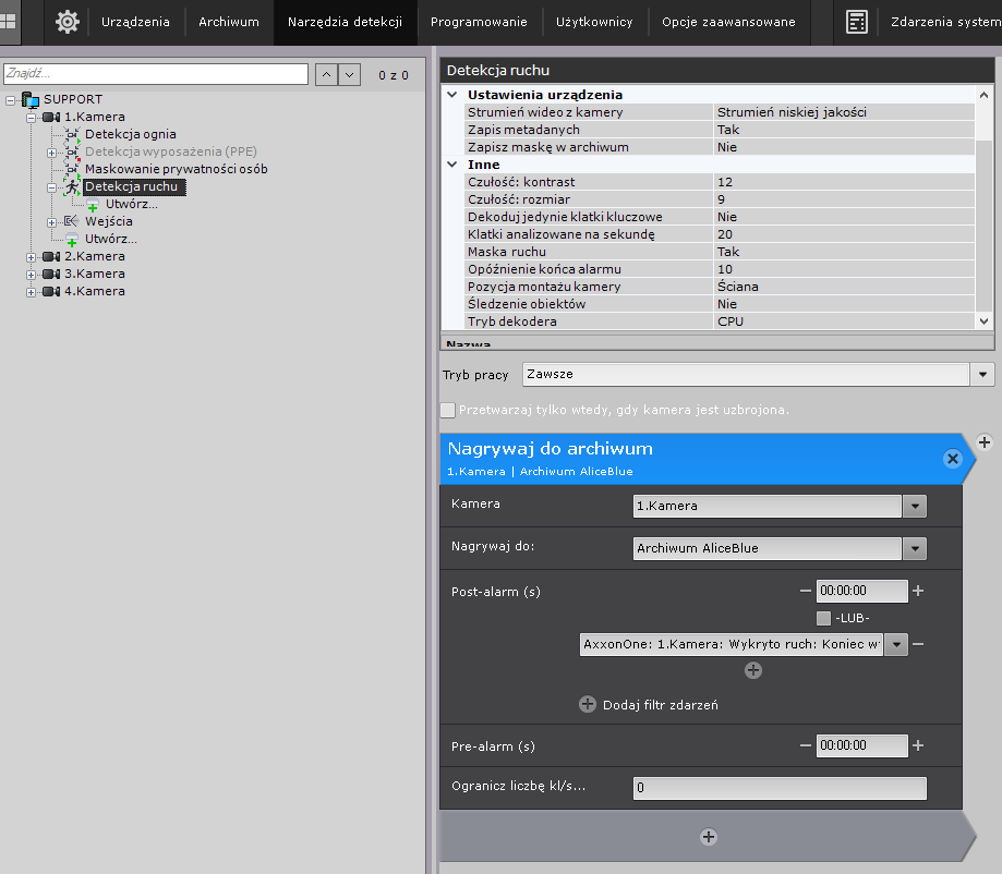 Jeśli utworzysz zestaw reakcji typu Nagrywanie do archiwum, nagrywanie zatrzyma się, gdy Analiza Sceny (zobacz: Konfigurowanie Narzędzi detekcji Analizy Sceny) przestanie być wyzwolona.