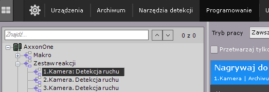 Okno interfejsu konfigurowania zestawów reakcji jest wyświetlane, gdy którekolwiek z narzędzi detekcji jest wybrane.