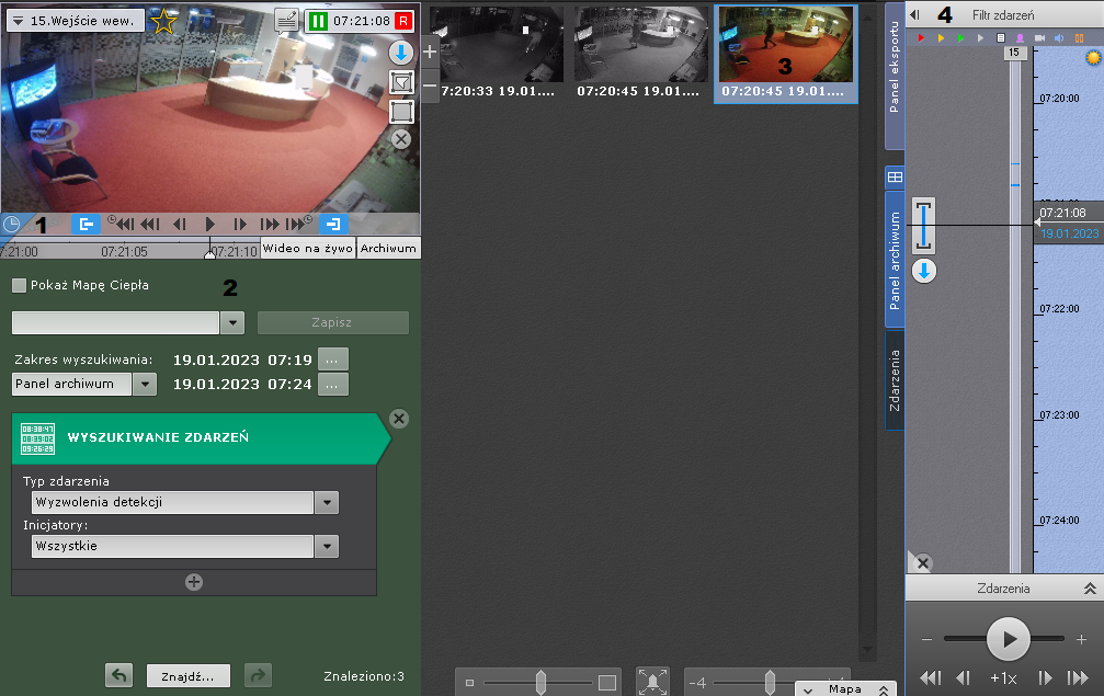 2. Panel kontrolny wyszukiwania (2; zobacz: Wyszukiwanie w archiwum pojedynczej kamery)