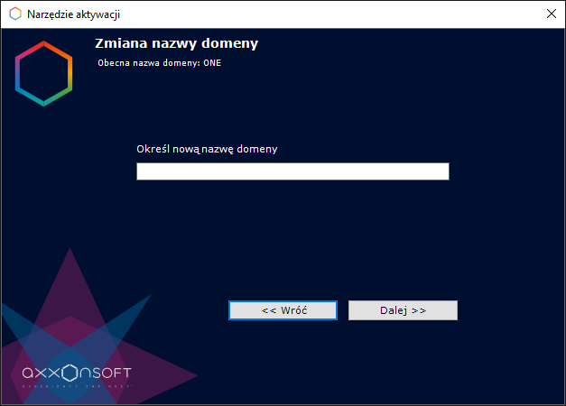 3. Podaj nową nazwę domeny Axxon i kliknij Dalej.