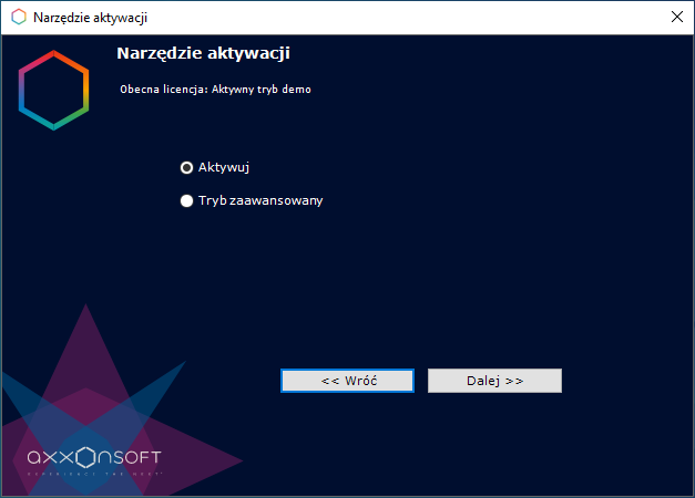 Aktywacja licencji dla pakietu oprogramowania Axxon One odbywa się za pośrednictwem odpowiedniego narzędzia. Uruchom Narzędzie Aktywacji korzystając z menu StartStart → Wszystkie programy → Axxon One → Narzędzia → Aktywacja produktu.