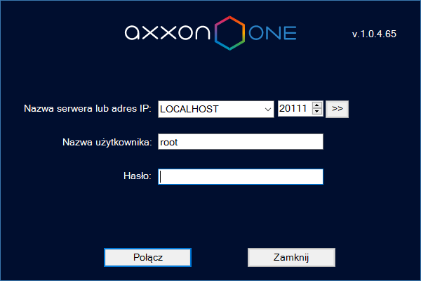 Po wykonaniu jednej z tych czynności, pojawi się okno autoryzacji. Aby zamknąć Axxon One (całkowicie wyjść z klienta), naciśnij Zamknij.