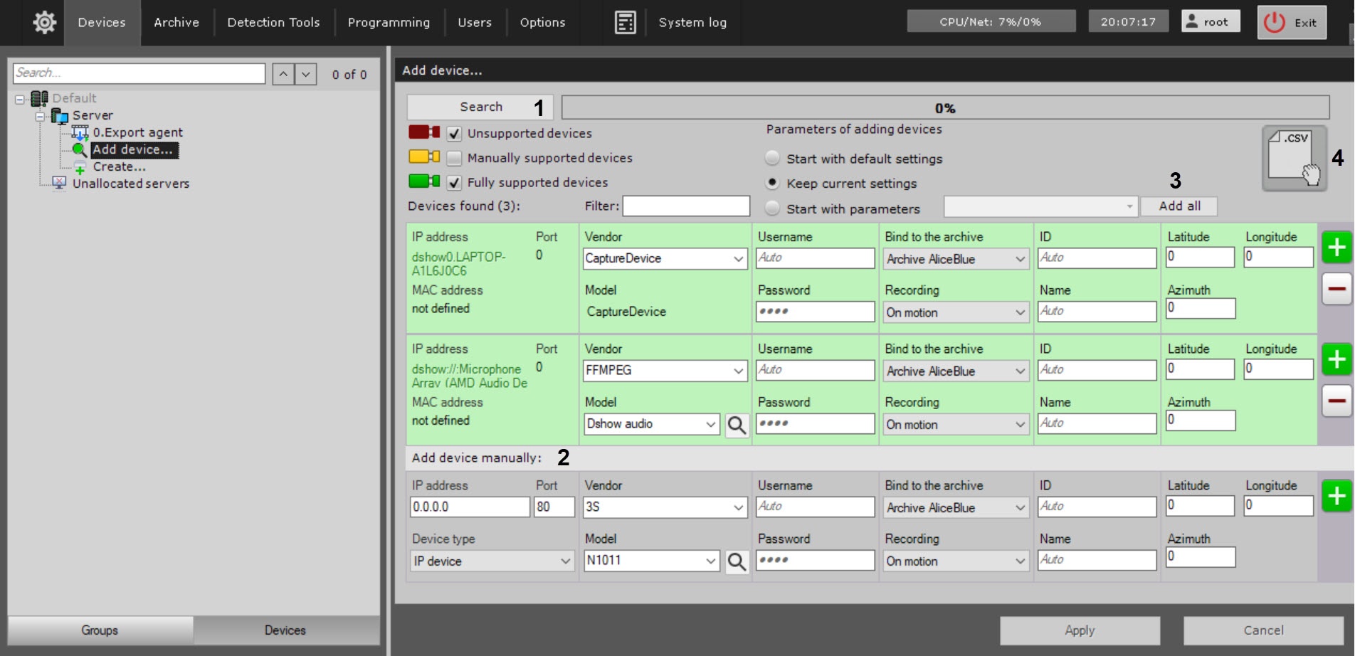 You can add IP devices to the system using the IP Device Discovery Wizard. To open the IP Device Discovery Wizard, click the Add device link at the end of the server device list.