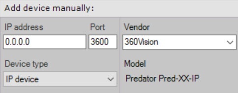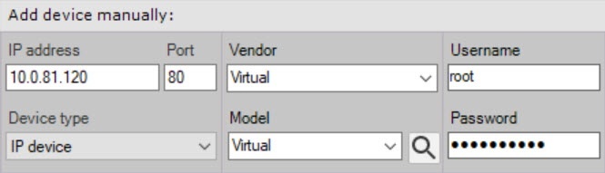 If the IP device is absent in the automatic search results (it is located on a different subnet or the connection with it is temporarily lost), you can add it manually. To do this, you need to select the type of the added IP device, specify the IP address and connection port of the device, and select the vendor and model in the area with a neutral background located under the list with automatic search results.