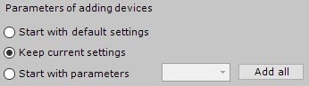| 3 | Start with parameters | The IP device is added to the configuration with the settings that have been previously specified for a device of the same model in the configuration. The template device from the corresponding list is selected.
