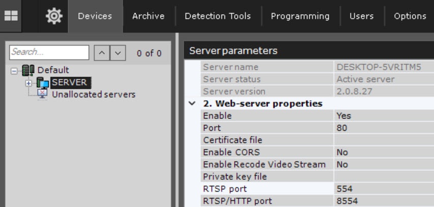 In the Web-server properties section, in the RTSP port field, specify the port number that you want to use to transfer data via RTSP protocol.