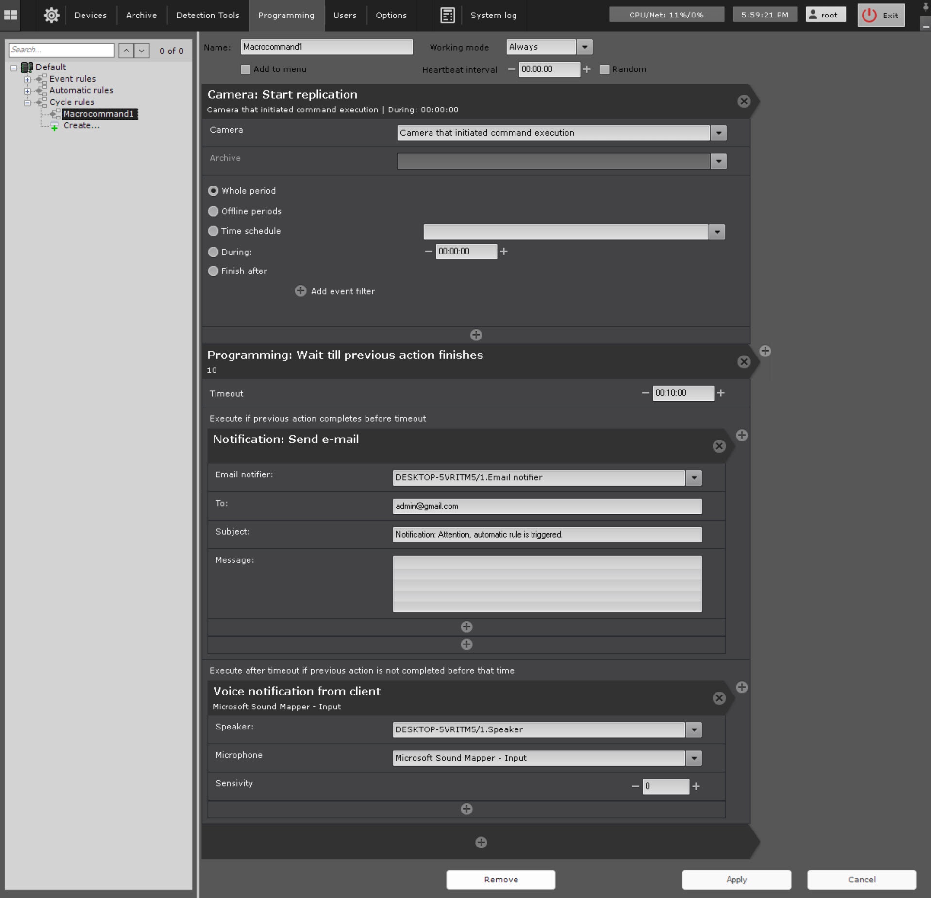 This macro starts replication and the program on the client simultaneously. If replication completes within 10 minutes, an email notification is sent, if not, a voice notification is played.
