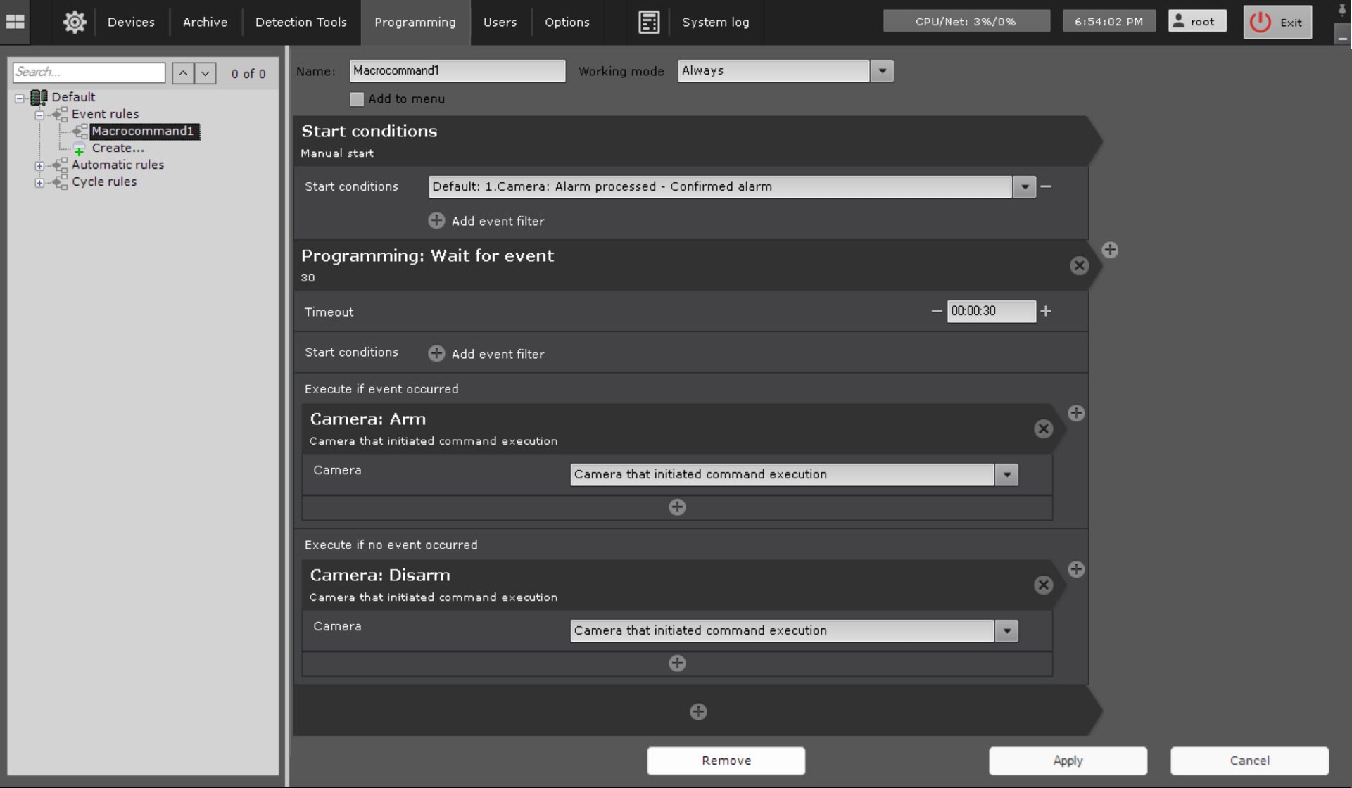 5. From the drop-down list, select Camera: Arm or Camera: Disarm.