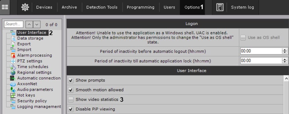 The video statistics will now be displayed in the surveillance window for the following modes: Live Video, Archive, Alarm, and Archive Search.