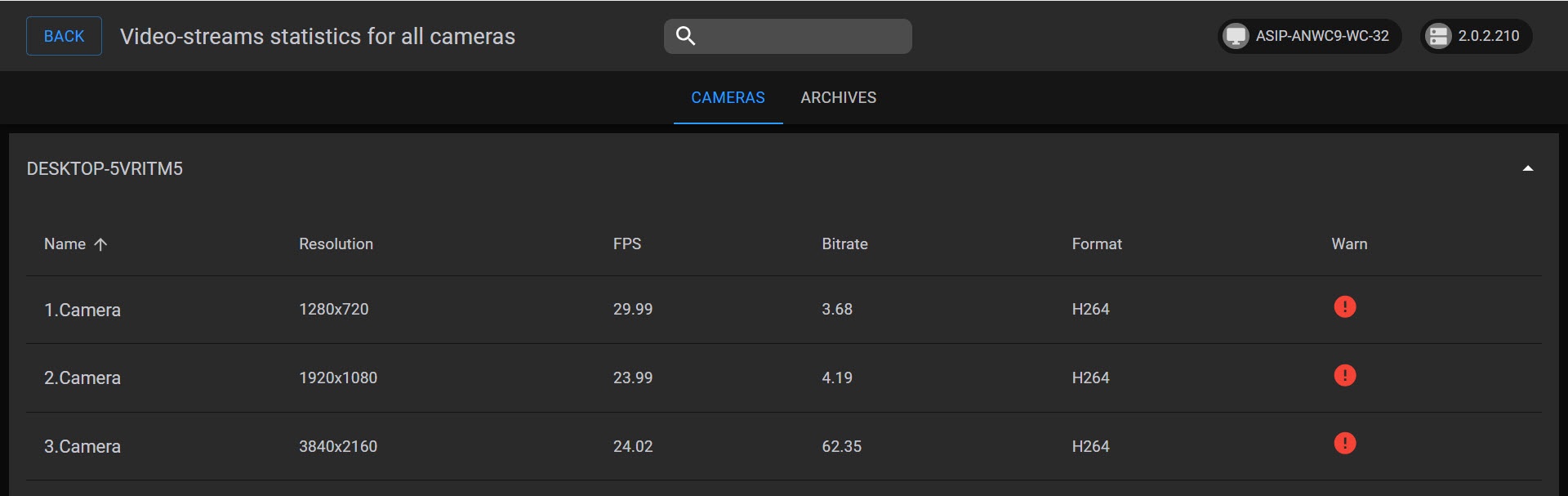 On the CAMERAS tab, the following information is displayed for each video stream of each camera: