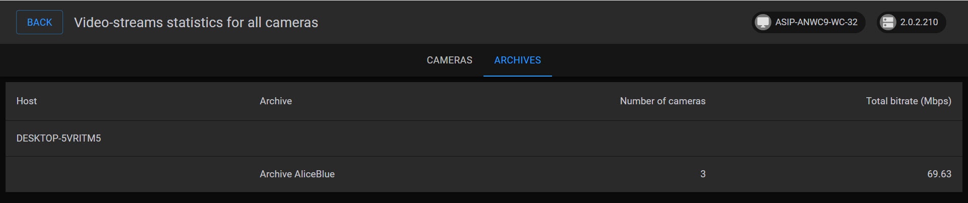 To view the camera and archive statistics, click the button in the top right corner and select Statistics Panel.