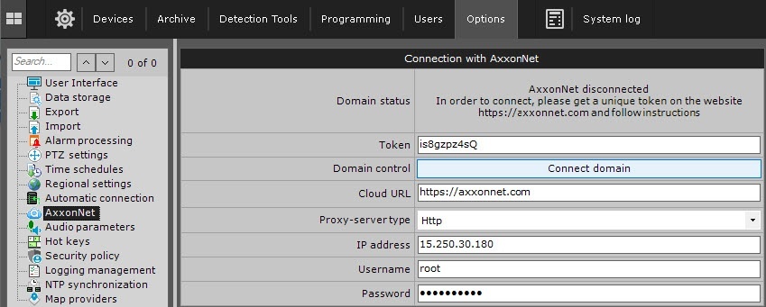 If the connection is successful, the status in Axxon One changes to AxxonNet connected. To disconnect the domain from AxxonNet, click the Disconnect domain button.