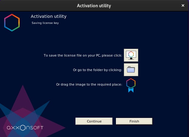 You have created an activation request file. To return to the main page of the utility, click the Continue button. To exit, click the Finish button.