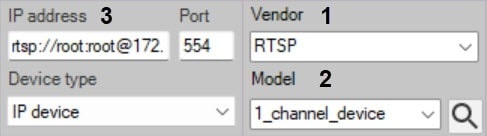 IP address—the address of RTSP transmission (3). In general, the address has the following format: rtsp://<IP address of RTSP server>:<Port of RTSP server>/<Path>. The RTSP protocol camera connection supports up to three video streams. To connect multiple streams, enter the transmission addresses separated by a semicolon: rtsp://<IP address of RTSP server1>:<Port of RTSP server1>/<Path>; rtsp://<IP address of RTSP server2>:<Port of RTSP server2>/<Path>; rtsp://<IP address of RTSP server3>:<Port of RTSP server3>/<Path>.