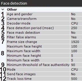 Track loss time 필드에 얼굴 추적이 손실된 것으로 간주되는 시간을 밀리초 단위로 입력하세요 (12). 허용되는 값의 범위는 [1; 10000]입니다. 이 매개변수는 얼굴이 프레임 내에서 움직이다가 잠시 장애물 뒤에 숨는 경우에 적용됩니다. 이 시간이 설정된 값보다 짧으면 얼굴은 동일한 얼굴로 인식됩니다.
