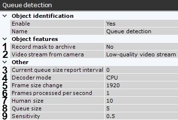 Camera. Detection "Queue detection" triggered, queue (min.: 10, max.: 10)
