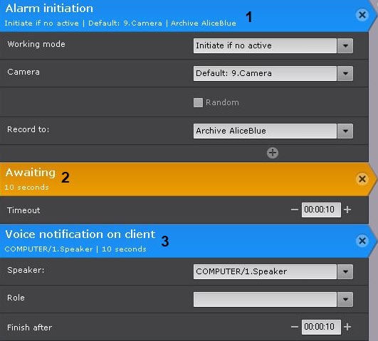 예를 들어, 해당 매크로를 실행할 때 시스템에서 경보가 발생하고(1) 10초 후에(2) 음성 알림(3)이 실행됩니다.