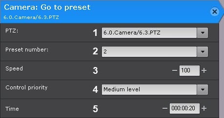 시간을 설정합니다 (5). 매크로가 실행 중이고 사용자의 접근 권한이 매크로보다 낮은 경우, 설정된 시간이 지난 후에만 PTZ 카메라를 제어할 수 있습니다.