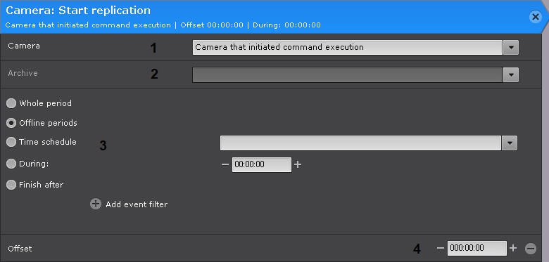5. 만약 이전 단계에서 During: 옵션을 사용한 경우, 오프셋(4)을 지정합니다. 이 경우 복제 구간은 다음과 같습니다: [동작 시작 시각 − 오프셋, 동작 시작 시각 + 지속 시간 − 오프셋]