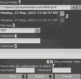 마스크되지 않은 프레임을 내보내려면(영상에서 프라이버시 마스킹 설정 참고), 사용자에게 적절한 접근 권한이 있어야 합니다. 이러한 내보내기를 수행하려면 마스크된 비디오 보기(View masked video) 확인란을 설정합니다 (6).