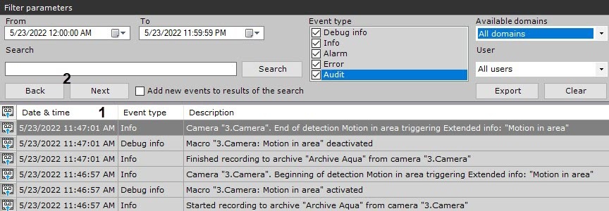 시스템 로그 이벤트 검색 결과는 표로 표시됩니다 (1).
