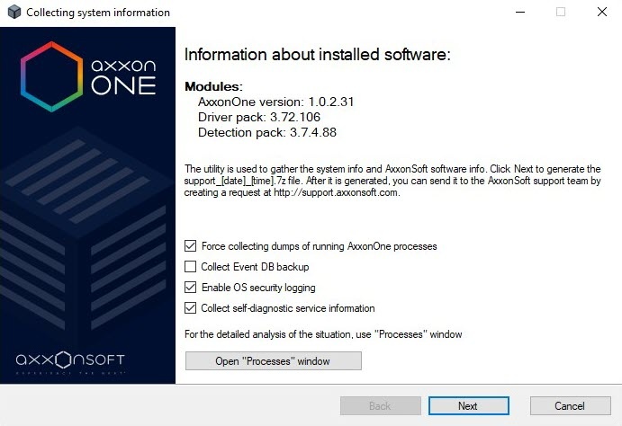 • Support.exe 유틸리티는 <Axxon One 설치 디렉토리>\Axxon One\bin 폴더에 있습니다.