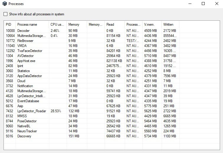 가능한 모든 Axxon One 프로세스 의 목록이 표에 나와 있습니다.