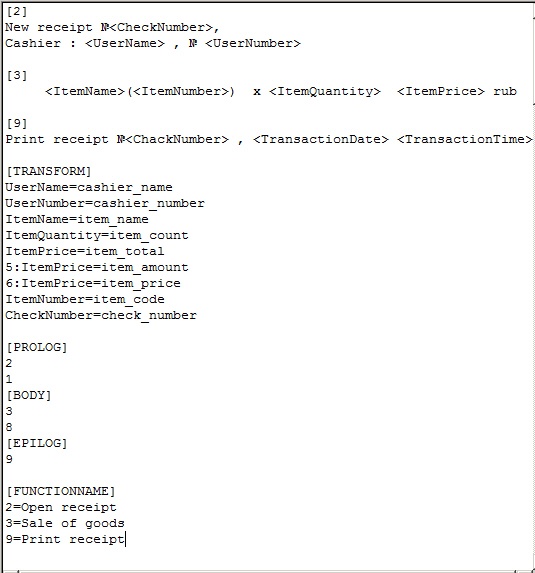 In this case, description in the [TRANSFORM] field is not required. - Matches of receiving function numbers (FunctionNumber) and their names are specified in the [FUNCTIONNAME] section. It's using for matching function numbers and their names in reports forming in accordance of operator search requests.