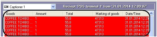 To view search results, select the tab of a required POS terminal, then select a transaction in the search results table. The number of the selected POS terminal and the date/time of the selected transaction are displayed in the search results header.