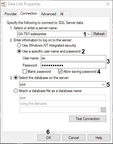 - Click the button in the Browse column (6). The Data Link Properties window will open in order to configure the database connection.