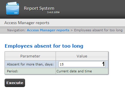 1. Select the Employees absent for too long report (see Selecting the type of Access Manager report). As a result the dialog box for specifying the report parameters will be displayed.