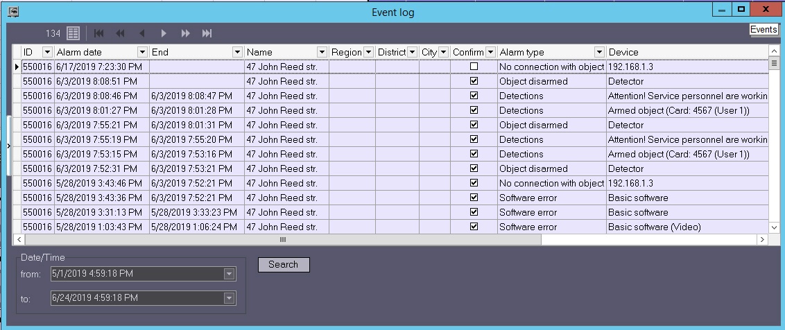 To view all the events registered in Monitoring, click the button (Event log). The Event log window opens. You can sort and filter this table by any column. By default, it is sorted by Alarm date descending, i.e. the newest events are in the top of the list.